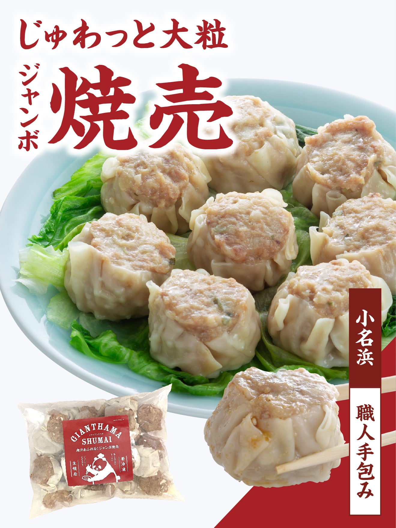 ジャイアントハマ・ジャンボ焼売の特徴はジャンボサイズとジューシーな餡。ひとくちでは収まりきらない大粒の食べ応えと、口の中でとろけるような、めいっぱいのジューシーを目指しました。20分間しっかり蒸すことで皮はもっちり、ジューシーな餡が贅沢な本格焼売をお楽しみいただけます。蒸し器調理のほか、フライパン調理でも美味しくお召し上がりいただけます。